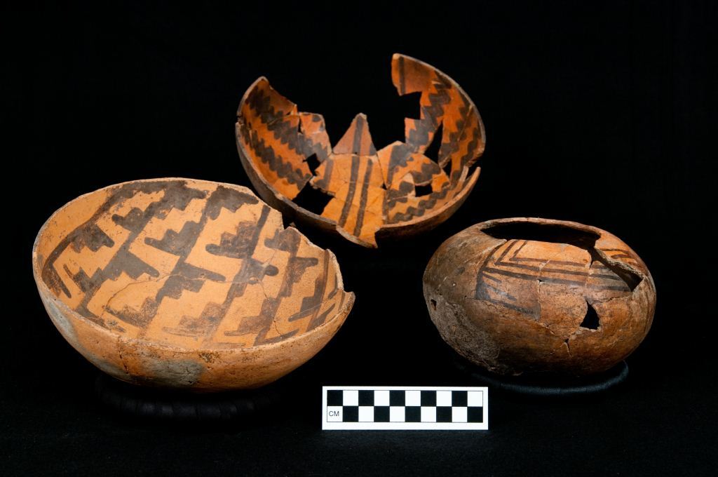 All three vessels recovered during investigations of the Dolores Archaeological Program. Top middle vessel was recovered from Windy Wheat Hamlet (5MT4644). Bottom left vessel was recovered from Hamlet de La Olla Olla (5MT2181). Bottom right vessel was recovered from 5MT2182 (Rio Vista Village). Photograph by Mark Montgomery and is the property of Crow Canyon Archaeological Center. Vessels are part of the collections of the Bureau of Land Management-Anasazi Heritage Center.