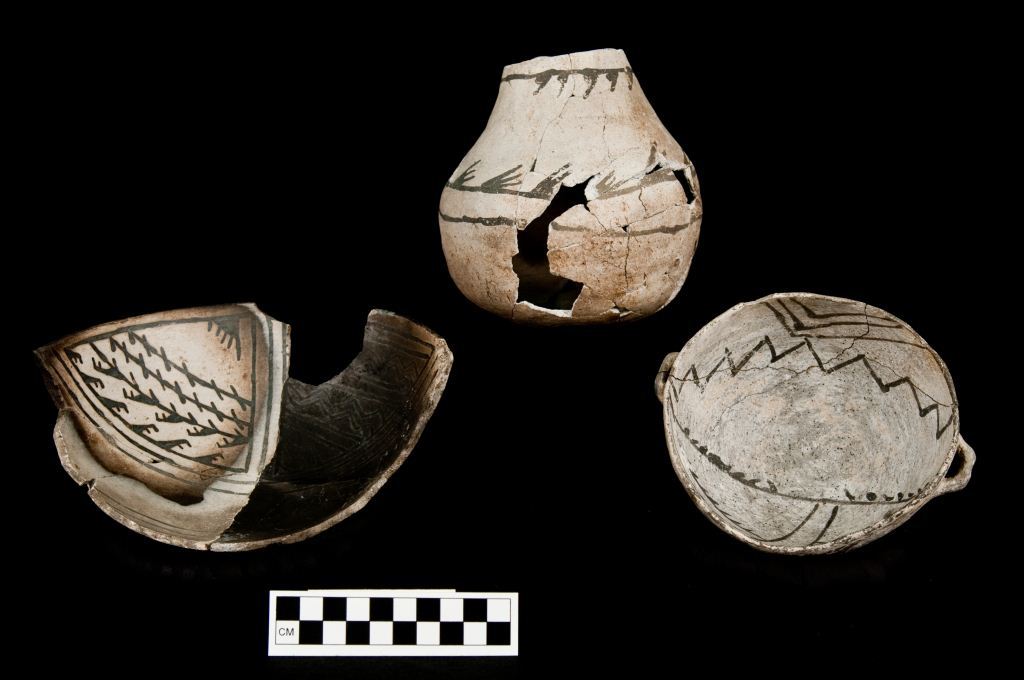 Vessels on the top and bottom left were recovered from Grass Mesa Village (5MT23) investigated during the Dolores Archaeological Program. Vessel on bottom right is from a unrecorded site in the Chappel collection. Photograph by Mark Montgomery and is the property of Crow Canyon Archaeological Center. Vessel is part of the collections of the Bureau of Land Management-Anasazi Heritage Center.