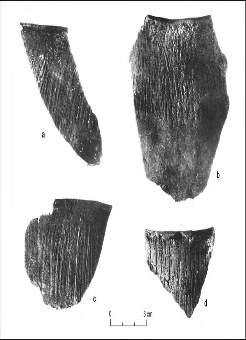 Sherds a & b from LA 45507 and sherds c & d from 70196 investigated during the Luna Highway Project. Photograph by Nancy Warren. Black and white photo of brown ware pottery.
