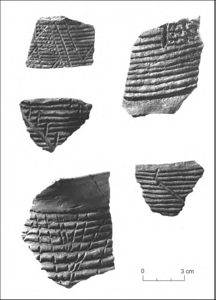 Sherds from LA 70185 investigated during the Luna Highway Project. Photograph by Nancy Warren. Black and white photo of brown ware pottery.