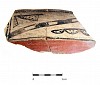The design field of Tewa Polychrome shouldered bowls is limited to a banded design bounded by the bowl rim and the bowl keel. In jars, this restriction of the design field is reflected in a limited design band around the jar bulge (Harlow 1973). Tewa Polychrome shouldered bowls are slipped on the rim and bowl underbody. The lack of interior painted decoration on these vessels reflects a significant change in the stylistic approach. This involved the use of red slip to cover some portion of the vessel interior, and may have allowed for increased expediency of the production of vessels for a growing number of Hispanic and Spanish consumers by limiting the size of area which was painted. In some cases, the red slip covers the entire bowl interior. In others, the red slip extends from the rim to the bowl keel. This increasing use of a red slip can also be seen in the treatment of other vessel forms. For example, the design band on soup plates is restricted to the wide flared rim of these vessels, while a red slip is almost always used to cover the vessel interior, and frequently covers the underside of the vessel. Tewa Polychrome jars are decorated with a narrow design band confined to the mid-body bulge. The remainder of the vessel is almost always red slipped from the rim to the design band. Red slip extends below the design band, sometimes covering the entire underbody of the vessel. Designs are executed in dark black organic paint, with a somewhat better control than earlier forms (Harlow 1973). Rims are covered with red slip but are not decorated. Although the design elements occurring on Tewa Polychrome vessels are comparable to those on earlier types, the emphasis on the solid triangle and its elaboration continues to increase in Tewa Polychrome. Thin parallel lines and dot filling continue to be the dominant design element. This is a continuation of a trend reflected by changes from Sankawi Black-on-cream to Sakona Polychrome. Solid triangles that are often elaborated with appendages are common. Design elements appear to vary little across different forms, and there appears to be considerable consistency across forms assigned to this type. Examples of Tewa Polychrome forms include shouldered bowls, hemispherical bowls, soup plates, and jars. Tewa Polychrome shouldered bowls exhibit sharp, well defined, angled keels (Harlow 1973). Tewa Polychrome soup plates are characterized by wide flared rims, which give way abruptly to a shallow bowl-shaped underbody.