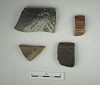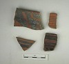 Pastes tend to be gray to reddish and temper consists of crushed sherd. Similar pottery with fine-grained, cream-colored pastes and sherd temper are considered to have a western origin and are typed as Heshotauthla Polychrome. The appearance of this type in areas along the southern portions of the Middle Rio Grande sometime during the thirteenth century appears to reflect the immediate influences of immigrants from the Zuni or Little Colorado area. Pottery assigned to this type is almost exclusively represented by bowls exhibiting glaze A rims. Both surfaces are well polished and covered with an orange to red slip. Both surfaces tend to be decorated with black, dark, brown, or green glaze paint. Exterior surfaces also contain decorations in white clay paint. Interior designs consist of geometric designs which include step figures, pendants, hatching, and broad and narrow designs, similar to those noted for the Tularosa style.