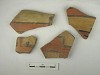 While the majority of rim sherds exhibit even walls well within the range defined for Glaze A types, a significant frequency of the rims are beveled, incurved or everted, and exhibit shapes similar to those described for Glaze C types. Vessels are well formed, slipped, and decorated. This type appears to have developed out of forms of San Clemente Glaze Polychrome and was largely produced at Pottery Mound and surrounding villages (Franklin 2007). This type represents an elaboration of polychrome forms where combinations of painted and slipped decorations resulted in combinations of three and even four colors including white, red, tan, and black on the same surface. The slip covers a paste that is red, sometimes with a gray core. At Pottery Mound this type was separated into two major variants, including one characterized by a chalky white slip and the other by a tan to buff slip (Franklin 2007). Designs are executed in a combination of black paint that is seldom runny or drippy, as well as in white and red slip clay. Despite the increased complexity of slip and design combinations employed, basic designs appear to be similar to those noted on earlier types including Aqua Fria Glaze-on Red and San Clemente Glaze Polychrome. Interior designs commonly include a combination of banded designs along with isolated motifs. An increase use of all-over designs is also evident. Overall designs involve the sweeping use of combinations of diagonal lines, and small irregular shaped lines filled with red paint. This type also exhibits an infrequent but increasing used of stylized designs including macaws and other birds and dragonflies. Combinations of styles noted in a minority of pottery assigned to this type is reminiscent of contemporary pottery produced on the Hopi Mesa. The various combinations of clay paste and slip as well as local basalt temper, reflects continual use of resources long utilized by potters in Pottery Mound area.