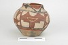 Santa Ana Polychrome was described and illustrated by Chapman (1938). For pottery produced in the first half of the eighteenth century, it is not possible to differentiate pottery made at Zia from Santa Pueblo (Harlow and others 2005). In the 1700s, the historic pueblo of Santa Ana (Tamaya) moved from a location along the Jemez River near Zia to farming lands along the Rio Grande (Batkin 1987). At this time, Santa Ana potters switched from using crushed basalt temper to river sand temper from the Rio Grande alluvial plain. Santa Ana pottery typically contains abundant sand temper in pastes ranging in color from beige to orange or gray, and vessels are decorated with black and red mineral-painted designs (Harlow 1973). In general, surfaces are not well-polished, and the white slip appears as pinkish-white, white, or cream, and is crackled or flaked off the surface. The red slip is thick and smooth. The black mineral paint fires true black, but is light on some sherds and dense black on others. The red mineral paint fires reddish-brown and consistently flakes off the surface, obscuring the shapes of design elements. Vessels assigned to early examples of this type are dominated by jars with large globular bodies and short necks with a gradual and narrowing slope, although bowls do occur.